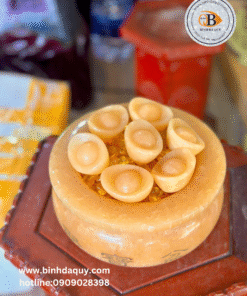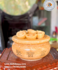 Sản phẩm bạn đang quan tâm là bát tụ bảo làm từ ngọc Hoàng Long vàng tự nhiên, nguyên khối – có kích thước chuẩn đường kính 20cm, cao 13cm, nặng khoảng 10,3kg, trong đó đã bao gồm 3kg đá vụn thạch anh ngũ sắc.