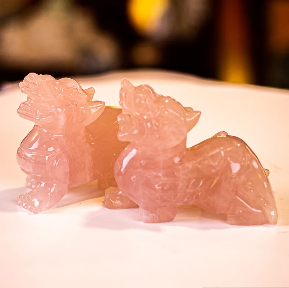 Thạch anh hồng là loại đá thạch anh có màu hồng và được biết đến với tên gọi Hyaline Quartz. Loại đá này có độ trong suốt mờ, bóng như thuỷ tinh thể. Thông thường, người sử dụng đá thạch anh hồng sẽ biết cách yêu thương bản thân. Đồng thời có thể tự chữa lành mọi vết thương lòng, mang lại bình yên cho chính mình. Thạch anh hồng phù hợp với cung mệnh Thổ, Hoà và được chế tác thành nhiều sản phẩm phong thuỷ. Trong đó, tỳ hưu là một linh vật phổ biến khi cũng được các nghệ nhân mài dũa bằng đá thạch anh hồng.