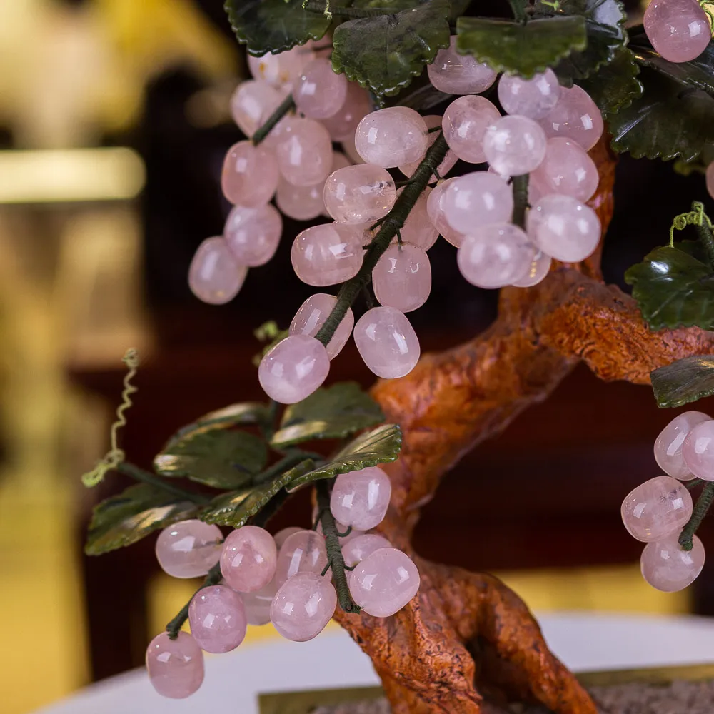 Cây nho đá tài lộc Quả – thạch anh hồng, Lá, Chậu – Ngọc Serpentine là biểu tượng của sự đông con nhiều cháu. Đem đến sự viên mãn trong hôn nhân hạnh phúc gia đình.
