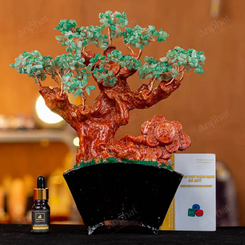 - Trọn bộ sản phẩm bao gồm: Cây tài lộc đá + dầu dưỡng đá + thiệp + giấy kiểm định chất lượng đá
