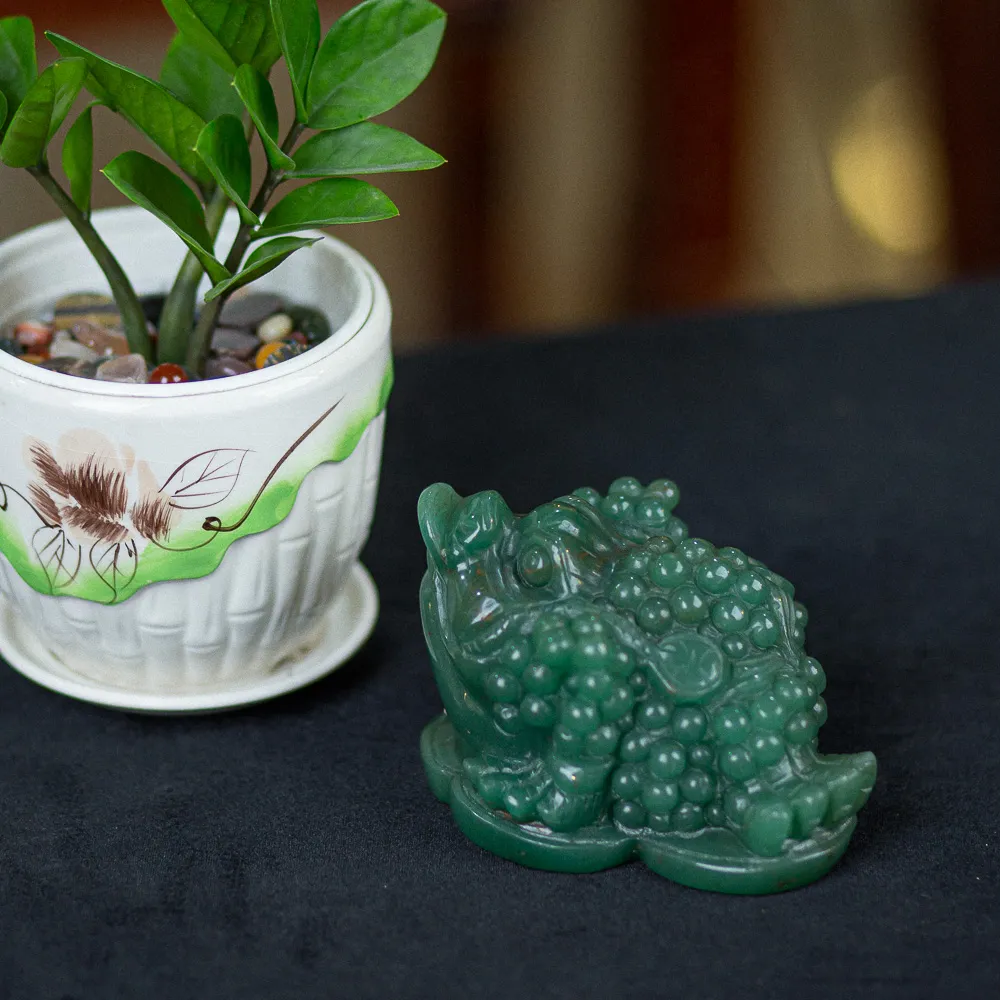 Thiềm thừ là một trong những con vật mang và giữ tiền trong nhà hiệu quả. Chính vì thế mà thiềm thừ khi làm bằng thạch anh xanh ngày càng tạo nên sức hút. Tại Đá Phong Thuỷ An Phát, chúng tôi luôn mang đến những vật phẩm có chất liệu tự nhiên. Ngoài ra, chúng còn được khắc hoạ theo chuẩn mẫu phong thuỷ do chính nghệ nhân hàng đầu trong lĩnh vực chế tác. Do đó, thiềm thừ thạch anh xanh tại đây mang màu sắc xanh của lá vô cùng tự nhiên. Cũng như chất liệu sở hữu độ thấu quang gần như là tuyệt đối.