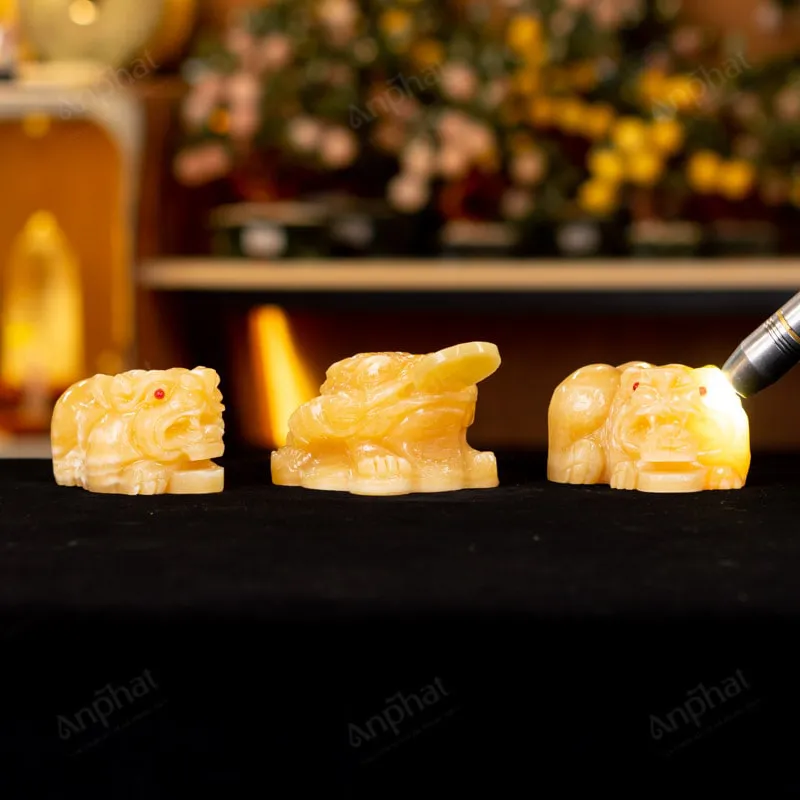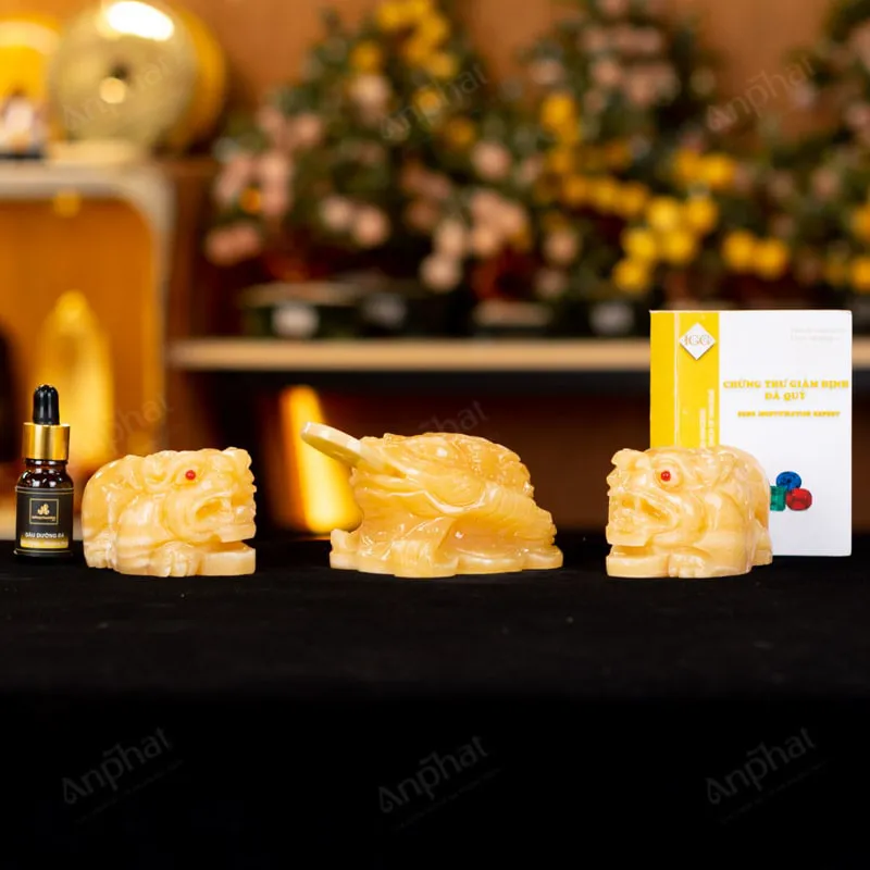 - Trọn bộ sản phẩm bao gồm: Combo linh vật + dầu dưỡng đá + thiệp + giấy kiểm định chất lượng đá + khăn thơm bao sái + giấy hướng dẫn trực tiếp an vị + khai quang tại chùa
