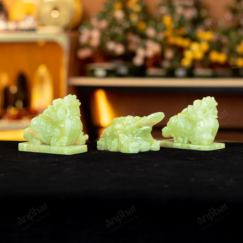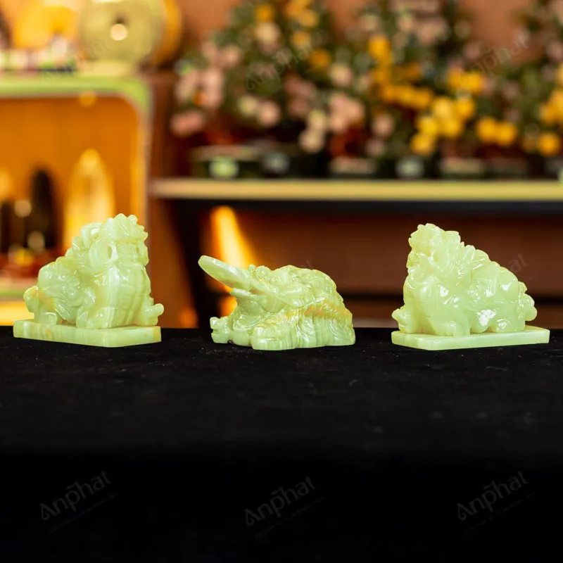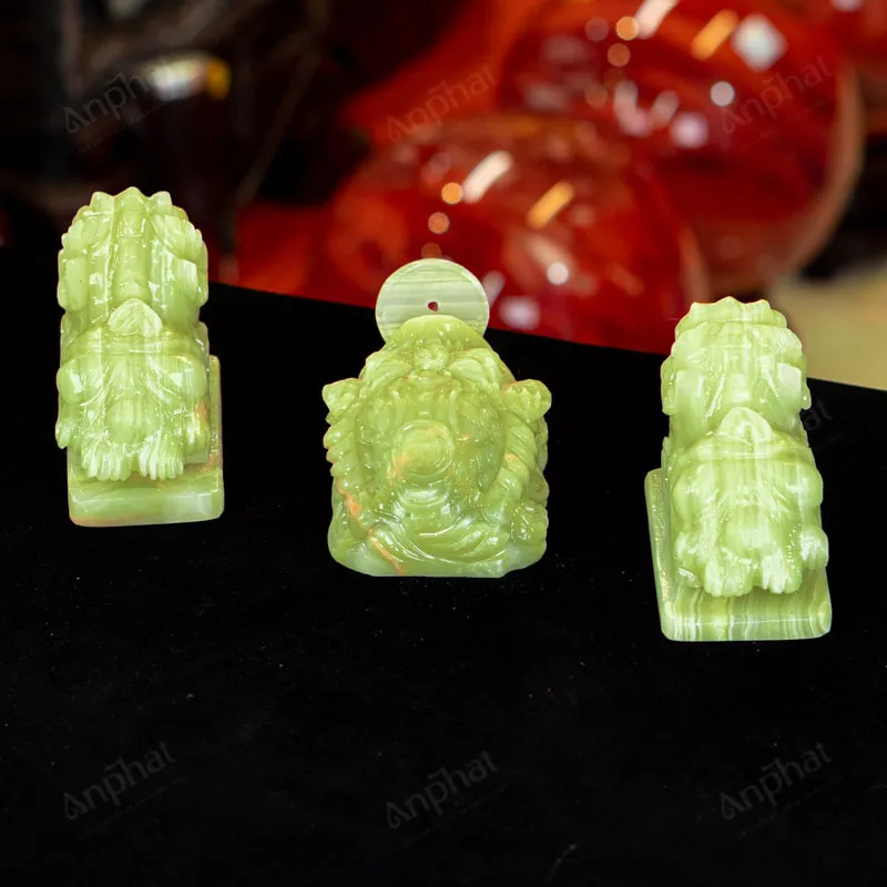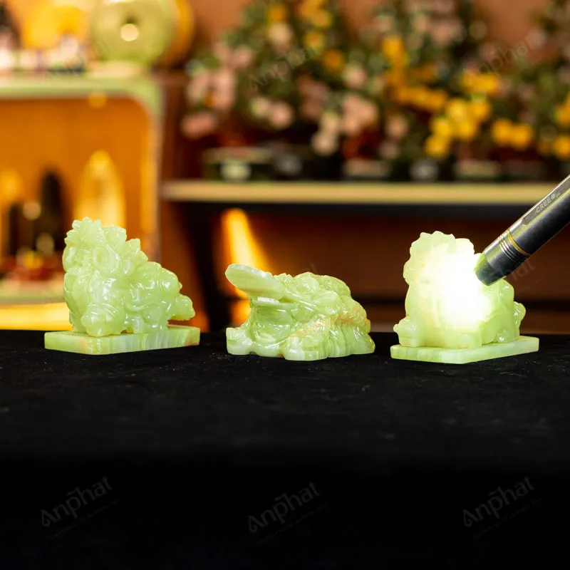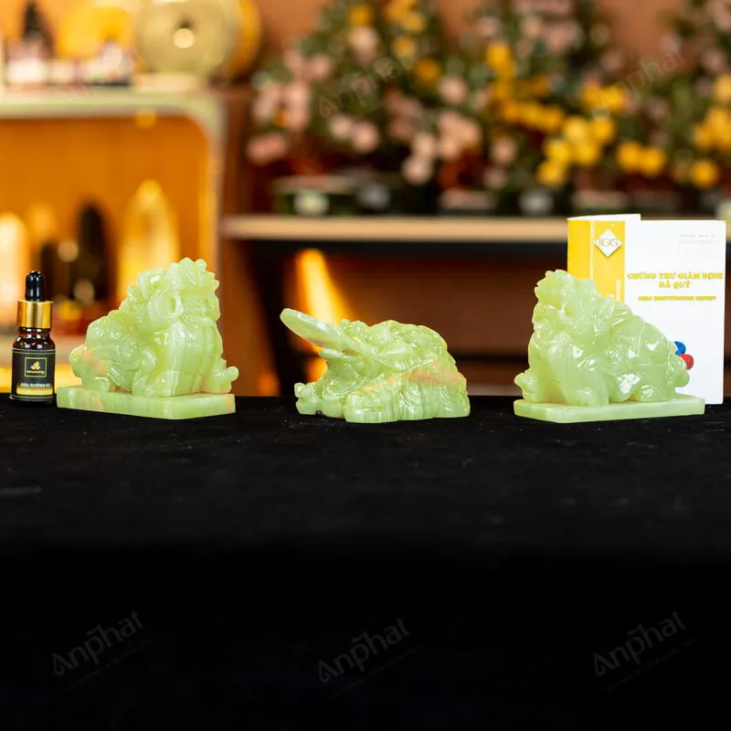 - Trọn bộ sản phẩm bao gồm: Combo linh vật + dầu dưỡng đá + thiệp + giấy kiểm định chất lượng đá + khăn thơm bao sái + giấy hướng dẫn trực tiếp an vị + khai quang tại chùa