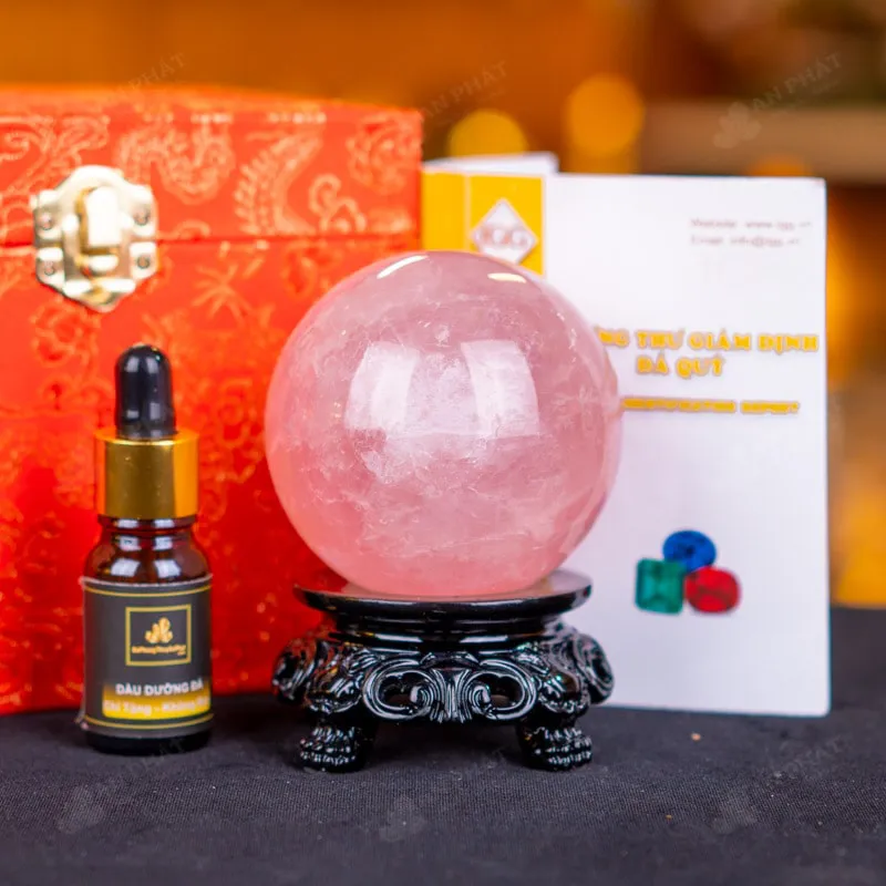 - Trọn bộ sản phẩm bao gồm: quả cầu + 01 đế gỗ + hộp đựng sang trọng + túi giấy sang trọng + dầu dưỡng đá + thiệp + giấy kiểm định chất lượng đá