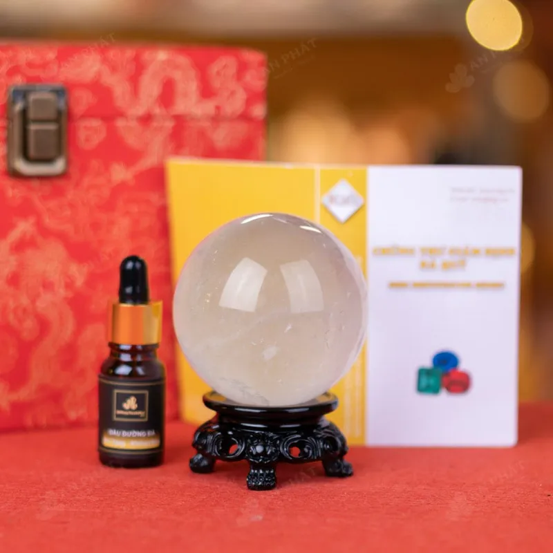 - Trọn bộ sản phẩm bao gồm: quả cầu + 01 đế gỗ + hộp đựng sang trọng + túi giấy sang trọng + dầu dưỡng đá + giấy kiểm định chất lượng đá