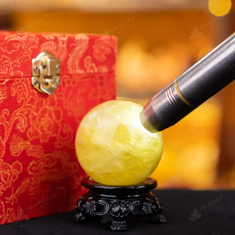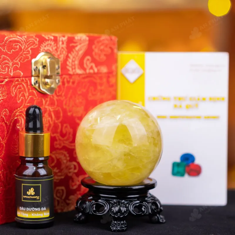 - Trọn bộ sản phẩm bao gồm: quả cầu + 01 đế gỗ + hộp đựng sang trọng + túi giấy sang trọng + dầu dưỡng đá + thiệp + giấy kiểm định chất lượng đá