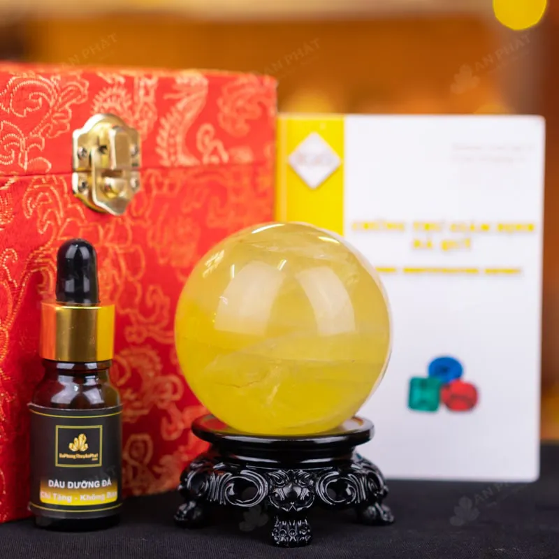 - Trọn bộ sản phẩm bao gồm: quả cầu + 01 đế gỗ + hộp đựng sang trọng + túi giấy sang trọng + dầu dưỡng đá + thiệp + giấy kiểm định chất lượng đá