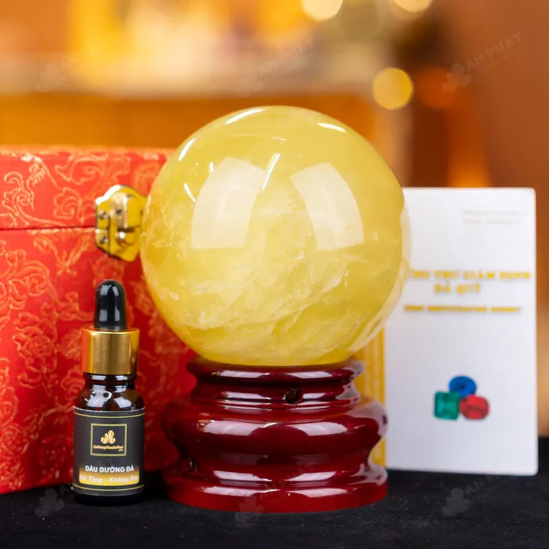 - Trọn bộ sản phẩm bao gồm: quả cầu + 01 đế gỗ + hộp đựng sang trọng + túi giấy sang trọng + dầu dưỡng đá + thiệp + giấy kiểm định chất lượng đá