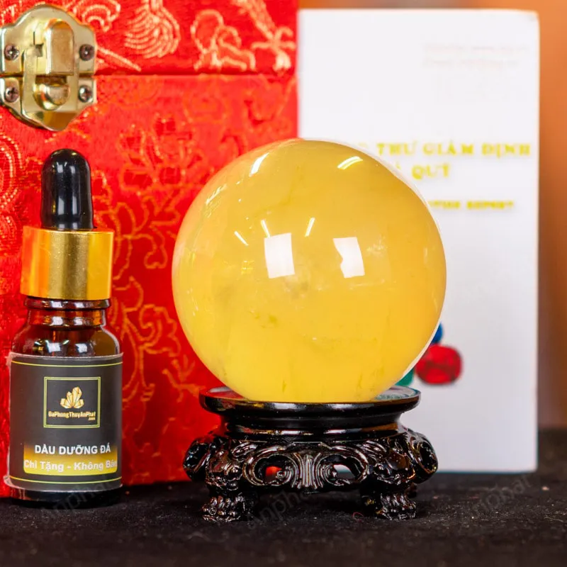 - Trọn bộ sản phẩm bao gồm: quả cầu + 01 đế gỗ + hộp đựng sang trọng + túi giấy sang trọng + dầu dưỡng đá + thiệp + giấy kiểm định chất lượng đá