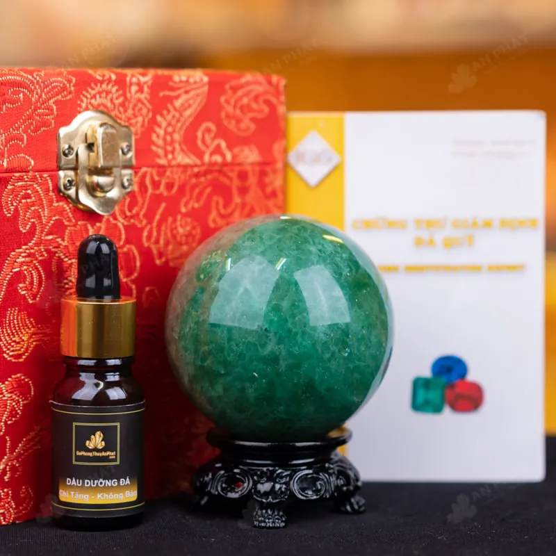 - Trọn bộ sản phẩm bao gồm: quả cầu + 01 đế gỗ + hộp đựng sang trọng + túi giấy sang trọng + dầu dưỡng đá + giấy kiểm định chất lượng đá