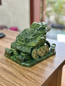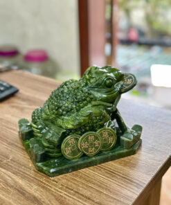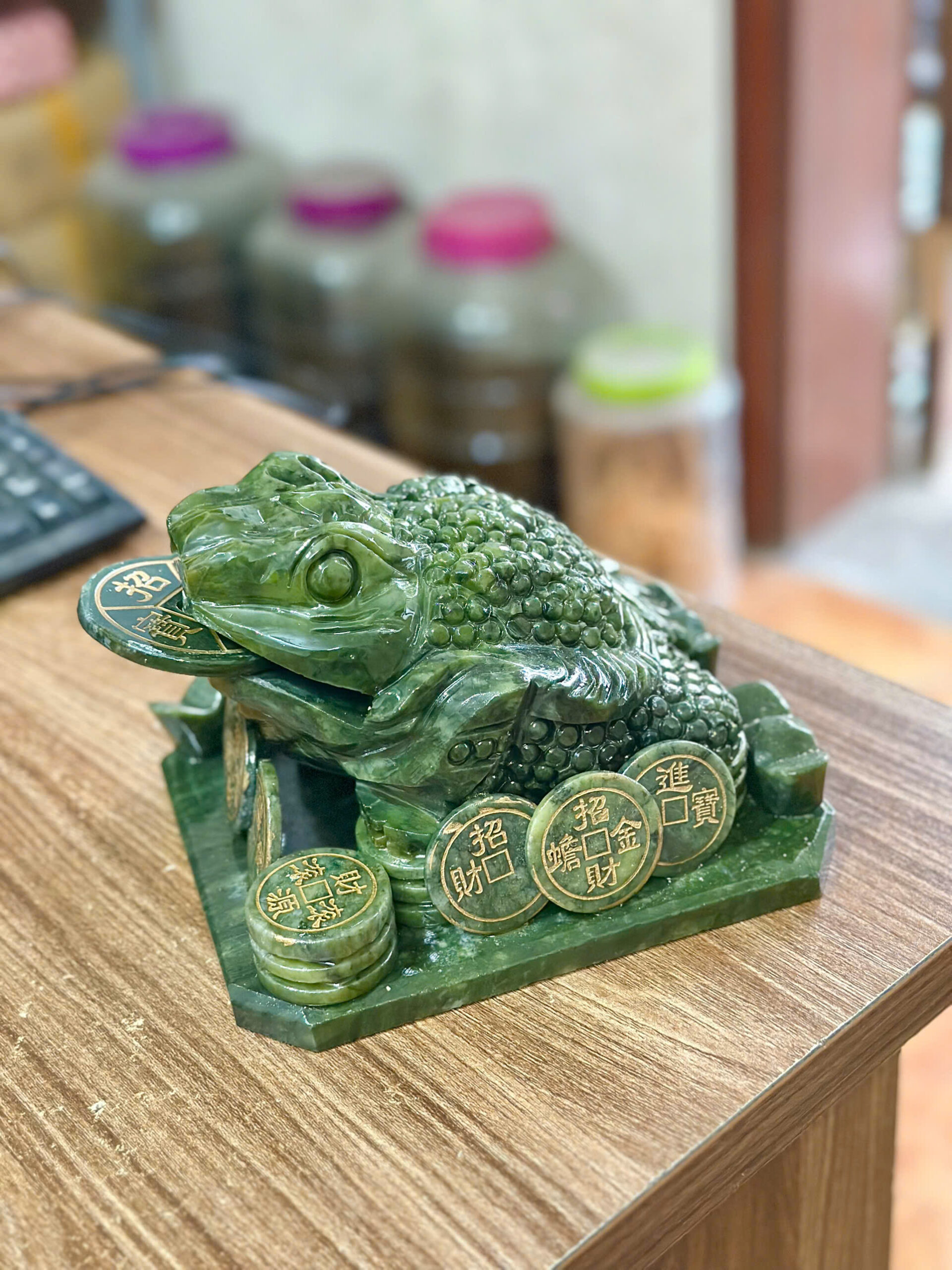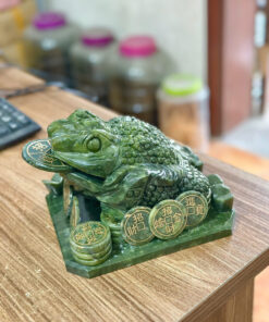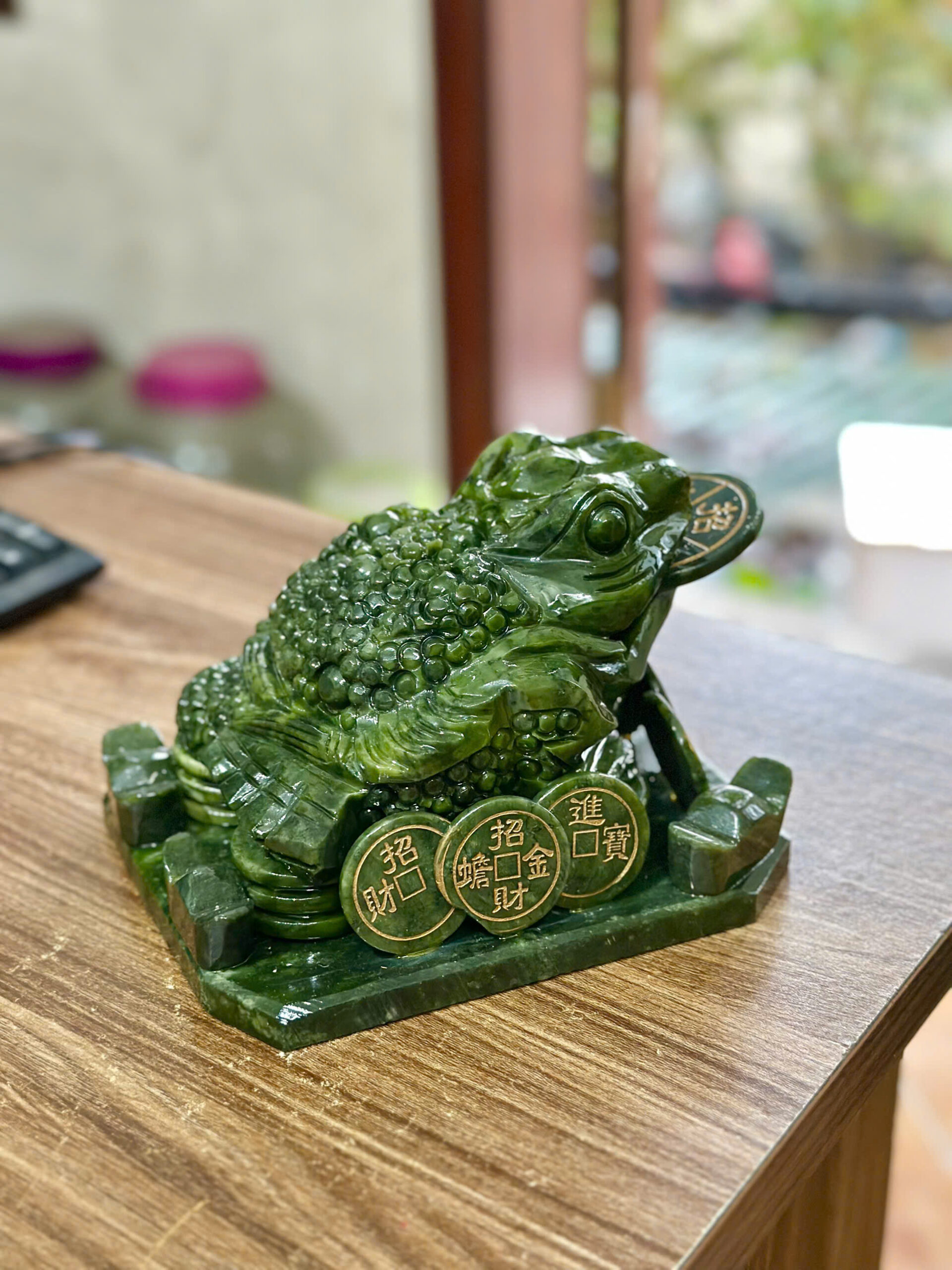 Trong phong thủy, Thiềm Thừ (cóc ba chân) được xem là linh vật chiêu tài hút lộc, biểu tượng cho sự thịnh vượng và no đủ. Đặc biệt khi được tạc từ chất liệu bột đá Serpentine xanh cao cấp, đặt trên đế gỗ và ngự trên đảo hoa mẫu đơn – thì đó không chỉ là một món đồ trang trí mà là pháp khí phong thủy thực thụ.