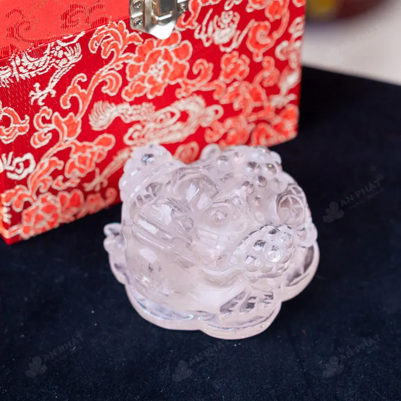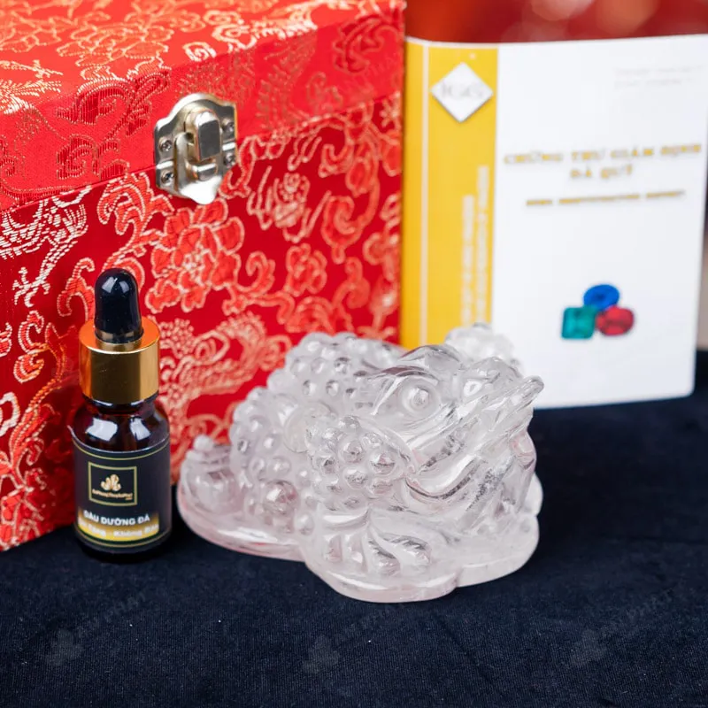 - Trọn bộ sản phẩm bao gồm: thiềm thừ + hộp đựng sang trọng + túi giấy sang trọng + dầu dưỡng đá + thiệp + giấy kiểm định chất lượng đá + khăn thơm bao sái + giấy hướng dẫn trực tiếp an vị + khai quang tại chùa Tứ Kỳ