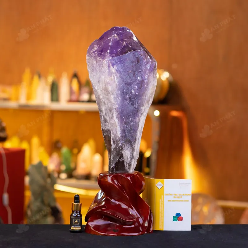 - Trọn bộ sản phẩm bao gồm: trụ thạch anh + đế gỗ + dầu dưỡng đá + thiệp + giấy kiểm định chất lượng đá
