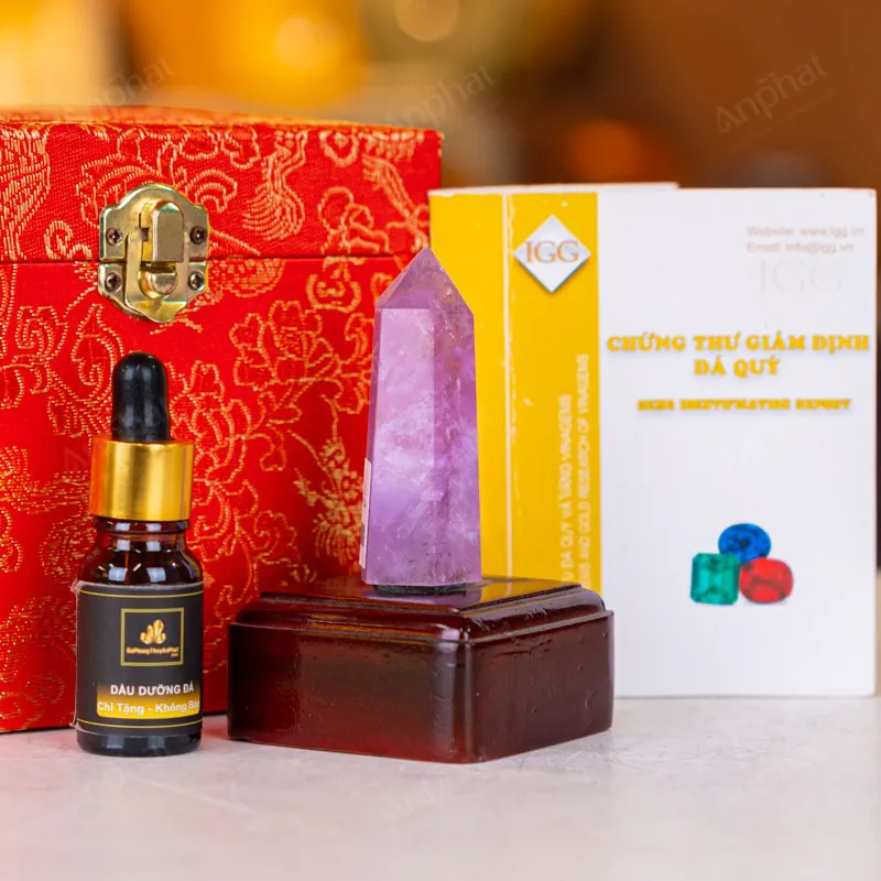- Trọn bộ sản phẩm bao gồm: trụ đá + đế gỗ + hộp đựng sang trọng + túi giấy sang trọng + dầu dưỡng đá + thiệp + giấy kiểm định chất lượng đá